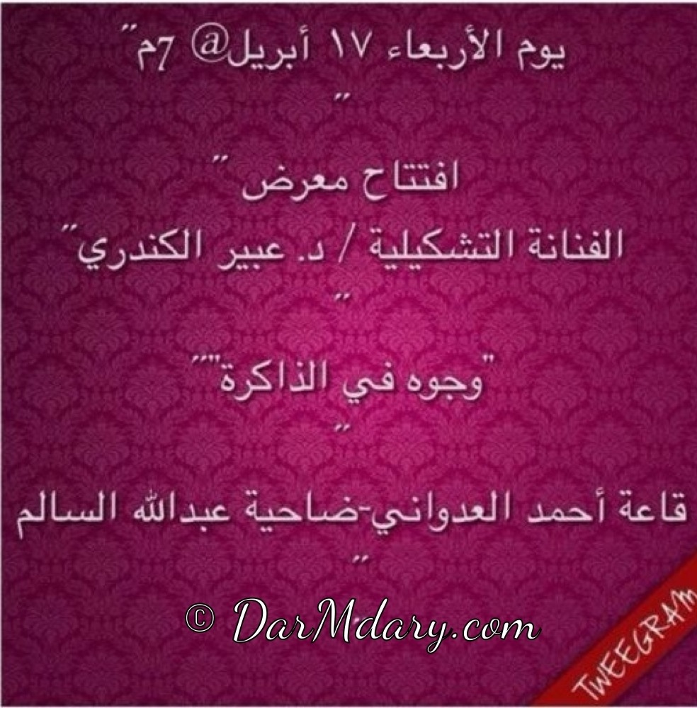 وصلت للبلوق دعوة من الفنانة التشكيلية د. عبيرالكندري لإفتتاح معرضها الشخصي بقاعة أحمد العدواني بضاحية عبدالله السالم