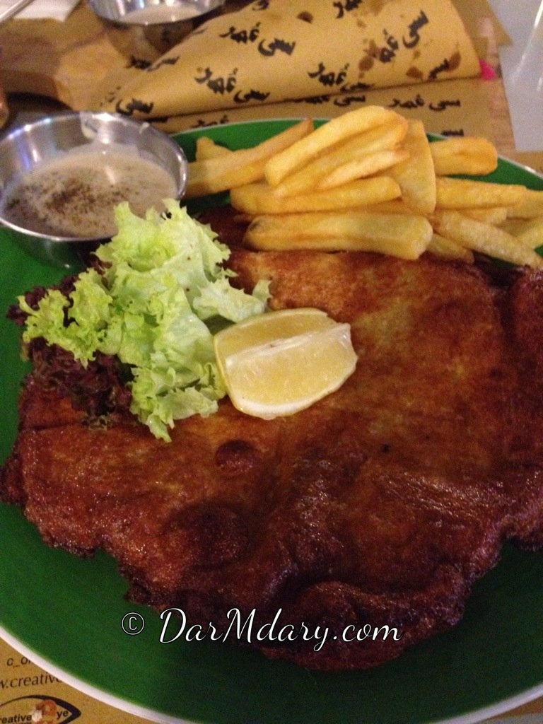 الاسكالوب الضخم بو العيال ما اعجبه طبقة البقصمات اللي عليها وايد سميكة جنها خبزة