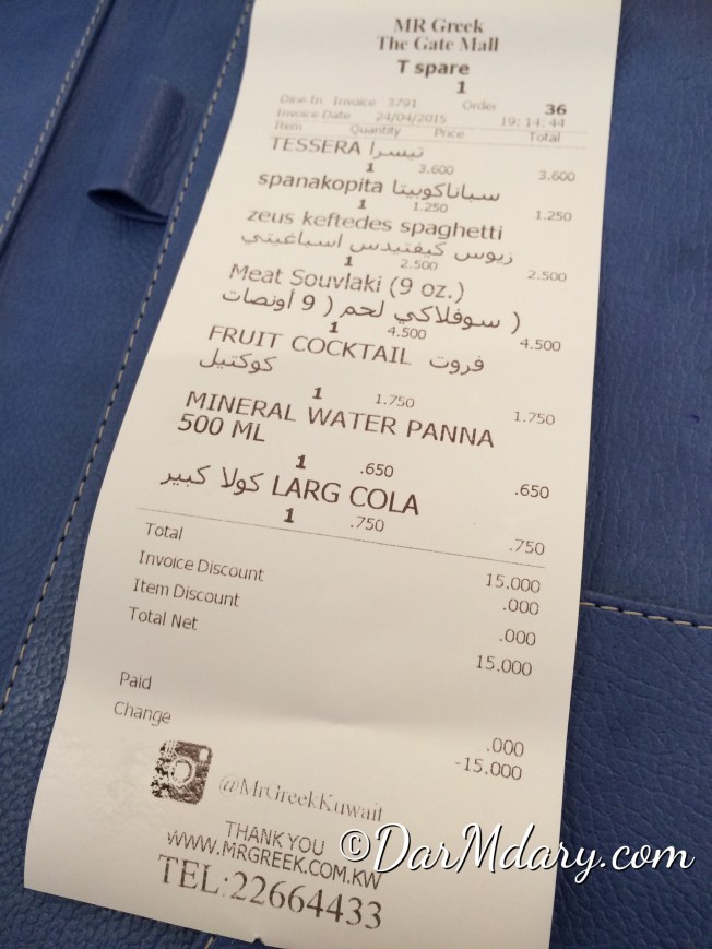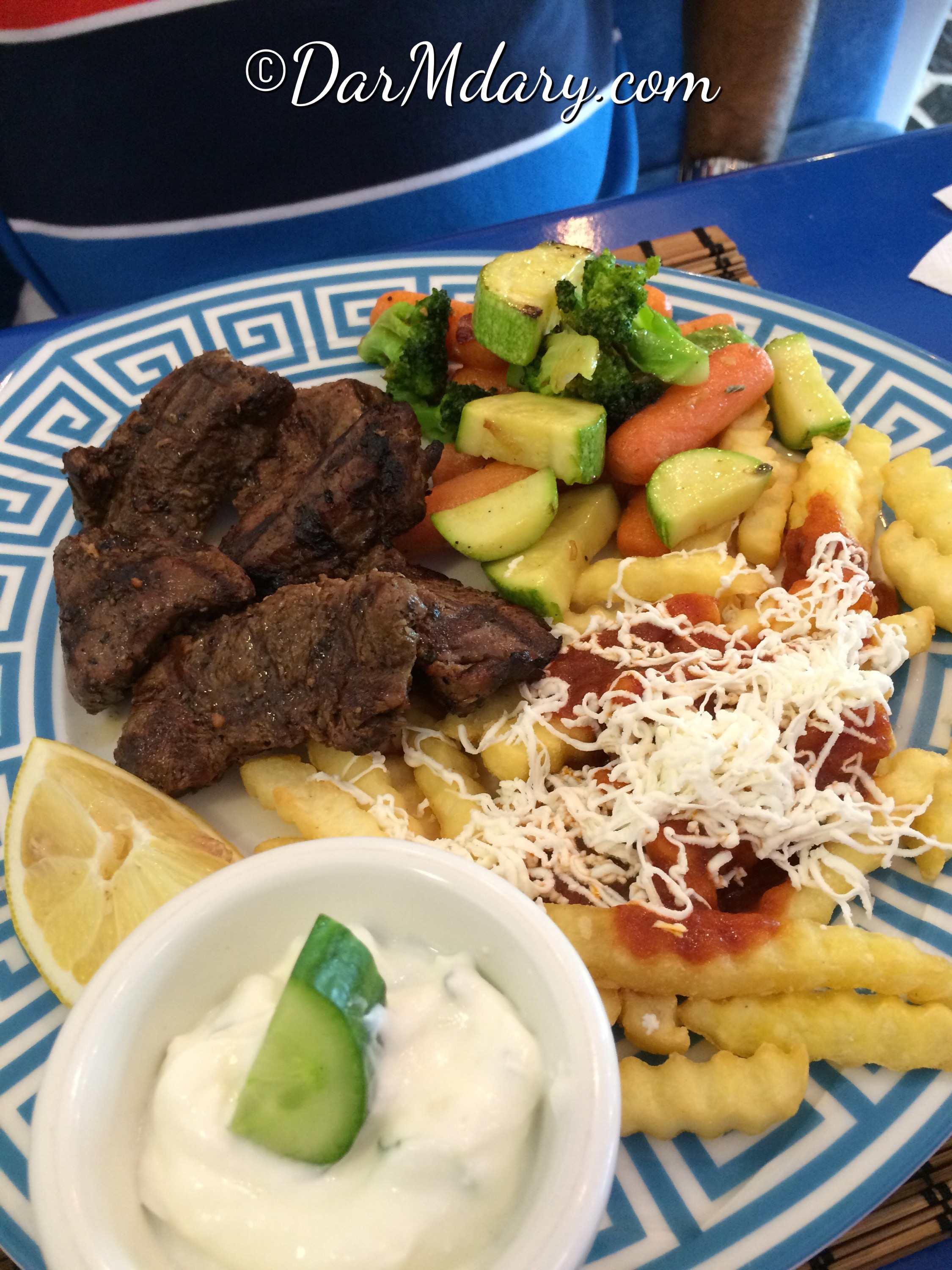 الكويت ما فيها مطاعم يونانية بس اللي جربته بمجمع ذا جيت بالعقيلة يونس و ديكوره يعيش الواحد جنه صج باليونان ، معروف الأكل اليوناني شبيه وايد بالتركي عندهم الكفتة و الشاورما وفطاير البرك و السلطة اليونانية ، المطعم عنده فروع بكندا و مشهور هناك و هذي بعض صور طلباتنا .