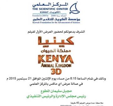 سبتمبر23 جديد المركز العلمي لعيد الأضحى ٢٠١٥ Posted on 23/09/2015 by amhouly قياسي أفلام الأيماكس العلمية بالمركز العلمي و جديدهم لهذا العيد فلم كينيا مملكة الحيوان ، و الذي يتكلم عن غابات السافانا و أشهر الحيوانات فيها ، فلم مدته ٤٠ دقيقة و سوف يدشن للجمهور أول أيام عيدالأضحى ٢٠١٥ و كل عام و أنتم بخير 29.287056 48.045904 شارك هذا الموضوع: النقر للمشاركة على X (فتح في نافذة جديدة) X انقر للمشاركة على فيسبوك (فتح في نافذة جديدة) فيس بوك إعجاب تحميل...